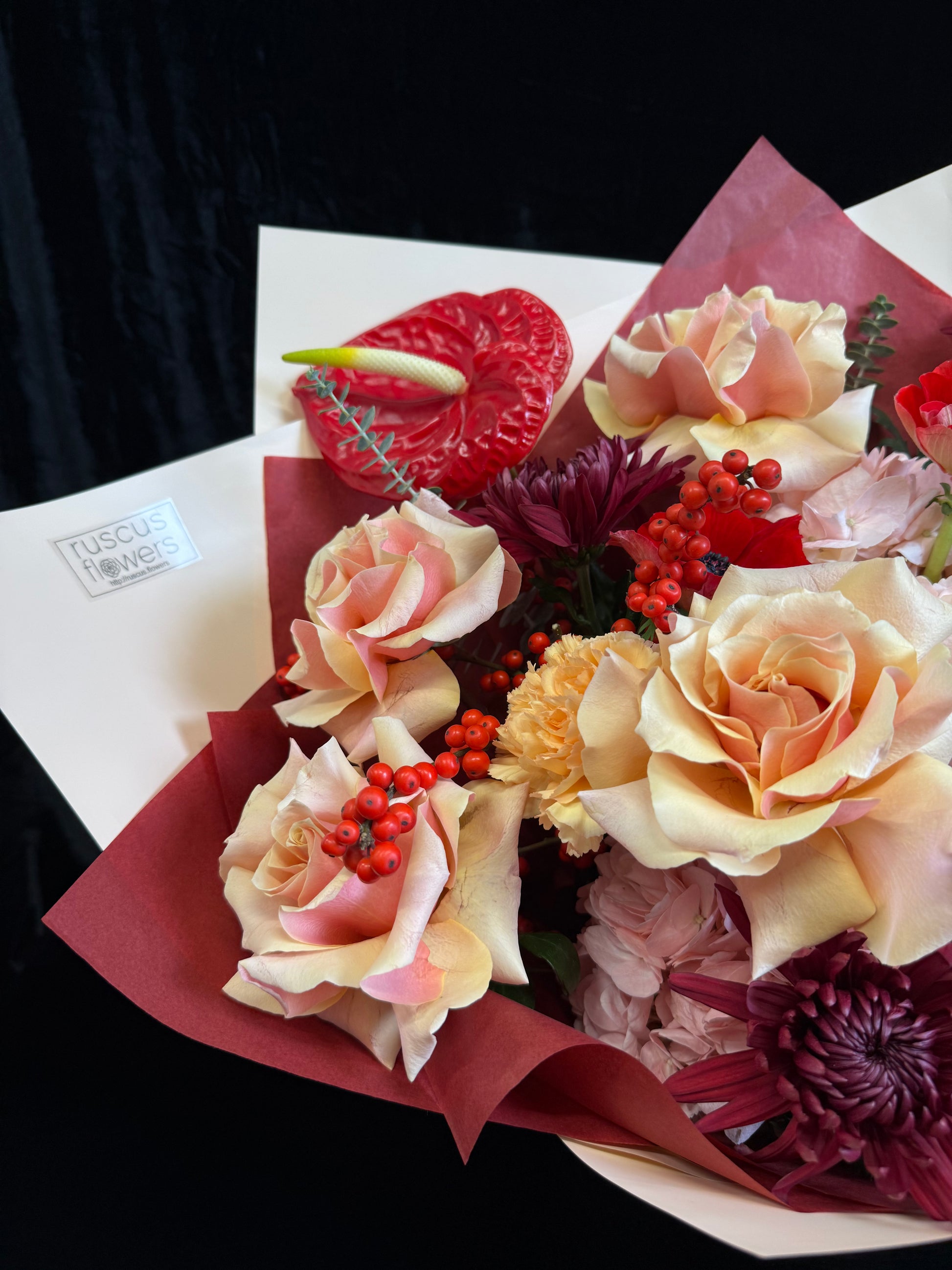 The Red Muse Bouquet is a luxurious handcrafted arrangement featuring garden roses, red anthuriums, burgundy chrysanthemums, soft carnations, anemones, seasonal berries, and fresh eucalyptus.